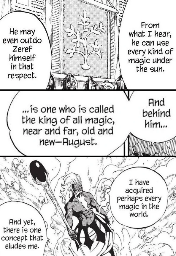 For many decades, August would go on to master numerous types of magical abilities, even being stated to rival Zeref himself in magical aptitude. Within the Alvarez Empire, August has 2 epithets, "Magic King" for his mastery of countless magics, and "Disaster" for his overwhelming strength.