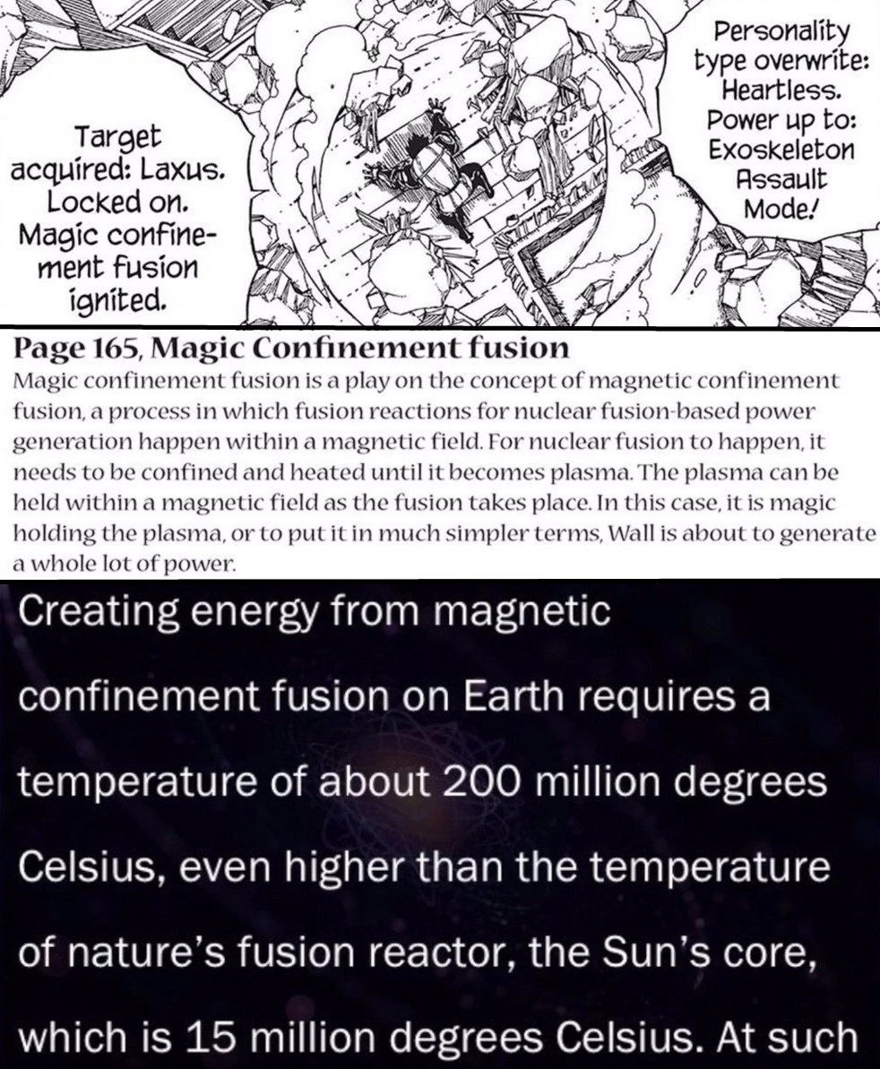 - Fire Manipulation, Explosion Manipulation, Damage Boost, Aura, Limited Flight, Heat Manipulation & Temperature Manipulation (Up to 200,000,000°C; The crux of his magical skillset, Fire Dragon Slayer Magic allows Natsu to manipulate the element of fire and produce it from any part of his body. Natsu finds himself using his abilities through various applications such as emitting powerful blasts and bursts of fire that can easily cause wanton destruction and huge explosions, unleashing destructive torrents of flames, creating constructs out of flames including wings, limbs and whips, covering his limbs in or engulf his entire body flames to augment the power of his strikes and propel flames from his feet for flight. Natsu has displayed the ability to control the temperature fo his flames as well as change the nature of his flames, allowing him to grasp objects with them or interact with fire as if it were solid[28][29][30][31][32][33][34][35][36][37][38][39][40][41][42][43][44][45]. In X792, his Base fire can vaporize sand, which makes it at least comparable in temperature to lightning[46]. In X792, Invel, who is the Chief of Staff in the Alvarez Empire and would know everything that the Spriggan 12 are capable of, stated that Natsu was the only person capable of melting his Ice Magic[47]. which would make Peak Base Natsu's Fire hotter than Wall's Magic Confinement Fusion, which is said to be the same as real life Magnetic Confinement Fusion, which produces temperatures of 200 Million Degrees Celsius[48][49][50]. His more powerful forms fire is far hotter than his Peak Base's Fire. His Savage Dragon Fire Form's fire is hot enough to burn Time itself)