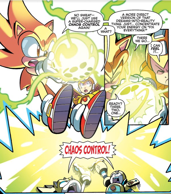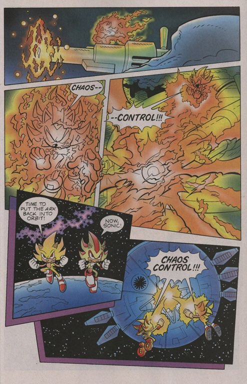 Chaos Energy Manipulation: In his Super form, Sonic's Chaos Energy based powers are enhanced on a tremendous scale. In addition, he gains new Chaos Powers. Due to being empowered by the Emeralds' Positive energies, Sonic is capable of neutralizing negative energies. He can also purify negative emotions, like when he reverted Perfect Chaos back to normal by purifying it of its anger and rage (rendering his will to fight inert). Also, Sonic can unleash powerful blasts of Chaos Energy and channel Chaos Energy to amplify the power of his strikes and form defensive barriers.